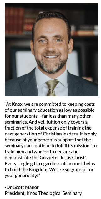 Knox Theological Seminary is a 501(c)3 tax-exempt organization, and your donation is tax deductible within the guidelines of U.S. law. Please keep your receipt as your official record. We'll email it to you upon successful completion of your donation.