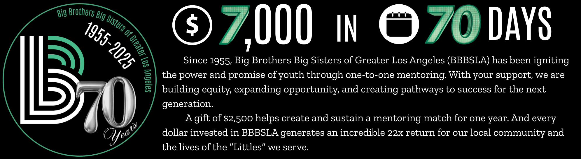 Join me in celebrating BBBSLA's 70-year legacy while helping shape our impact over the next 70 years! Your gift will support stronger resilience + youth mental health today, while building BIG bright futures for the leaders of tomorrow!