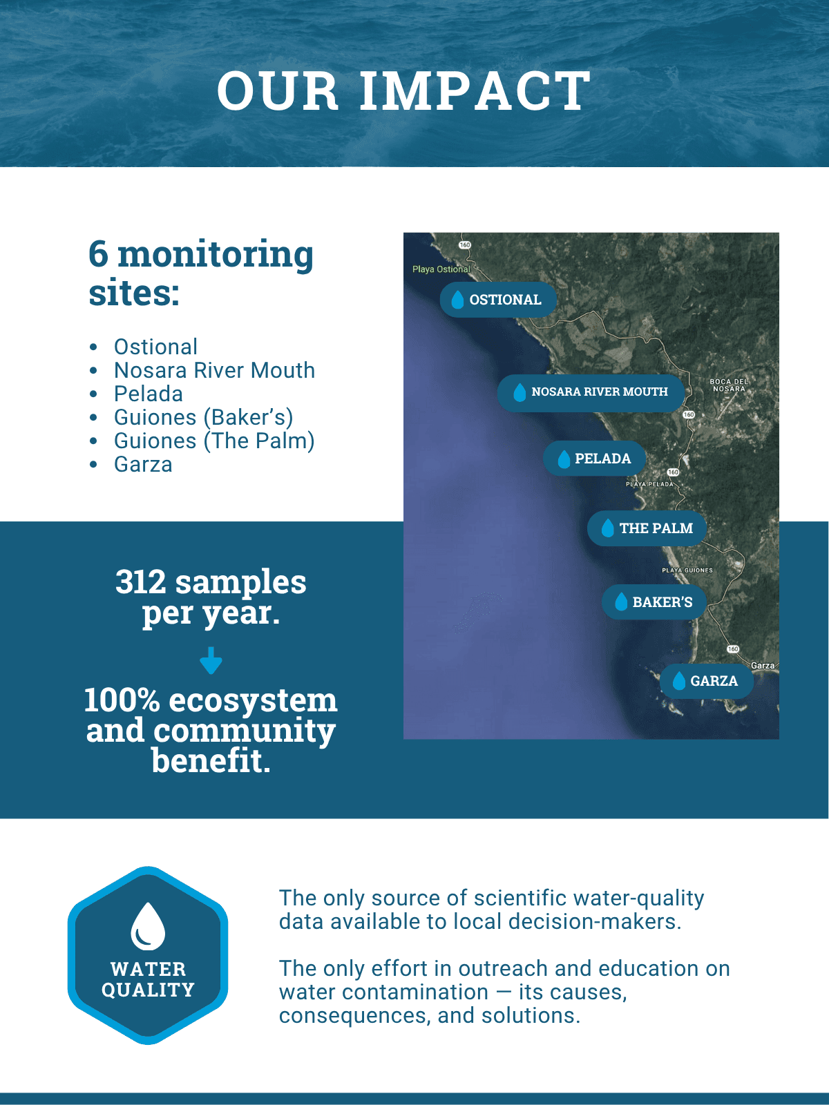 The only scientific source monitoring water contamination in Nosara. Our team measures fecal bacteria and other key indicators at six coastal sites every week.