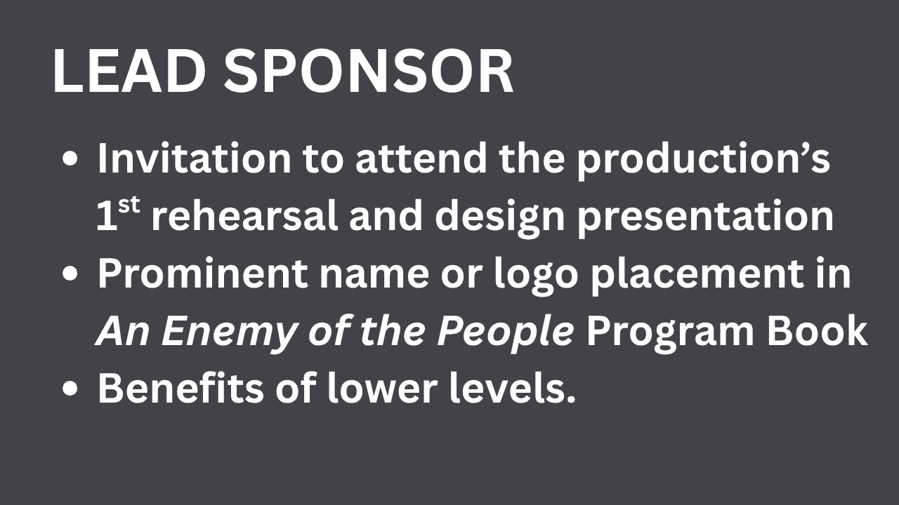 We are pleased to share a range of levels to support the production of An Enemy of the People. Donors will be recognized in Backstory magazine, online, and will be invited to special events related to the production.