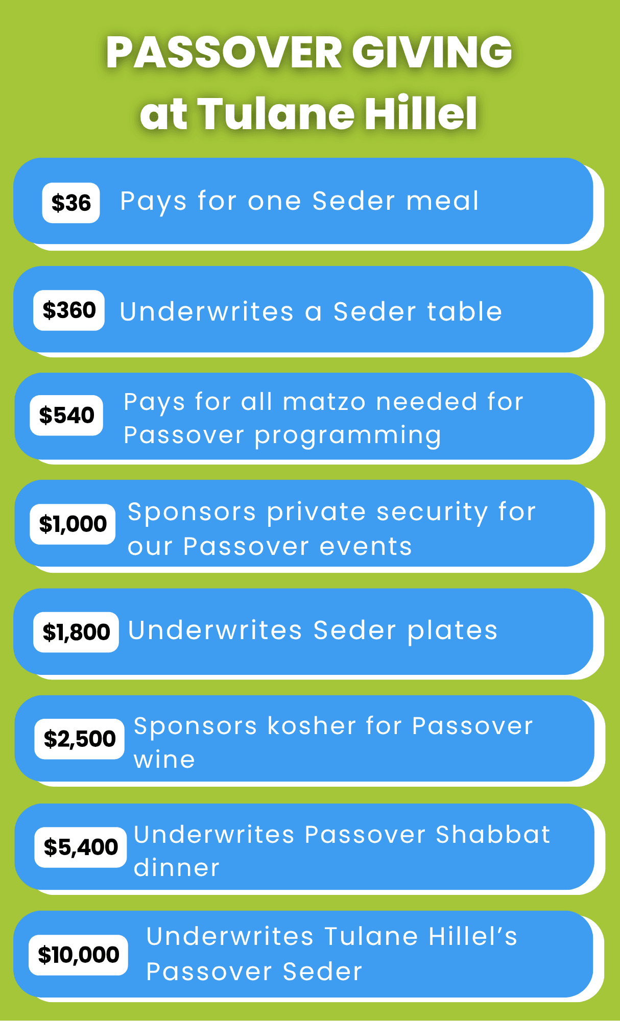 At Tulane Hillel, we're proud to offer all students and community members a place at our Seder table at no cost. However, we respectfully suggest a donation of $36 per participant to help offset the cost of each meal. For additional sponsorship opportunities, please see our full Passover giving menu below.